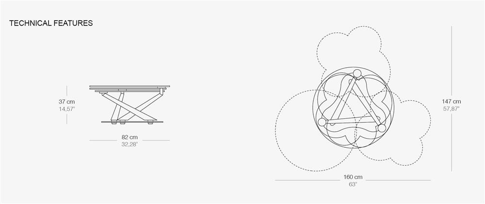 Extensible coffee table with 3 synchronized revolving tops in glass or ceramic. The peculiar tops and mechanism geometry allows the lower tops to be hidden in the closed position. Base and supports in painted or chromed steel.