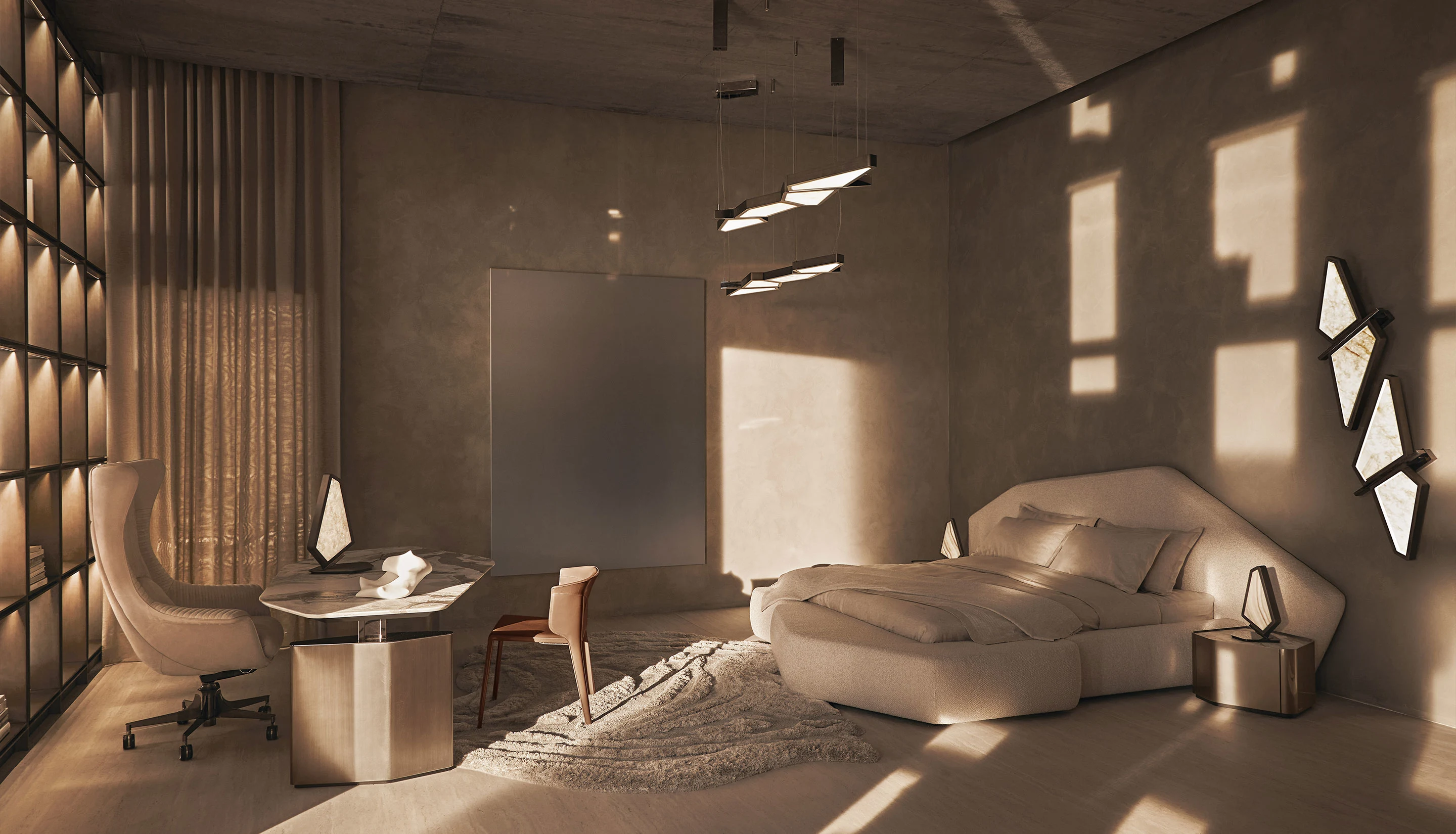 Neolito is an asymmetric bedside table with differentiated dimensions in lacquered wood and marble. Shaped wooden structure with a glossy lacquer finish in RAL/NCS colours or metallic finishes, featuring slanted sides and a shaped door. Top in marble with a 'leather' finish.