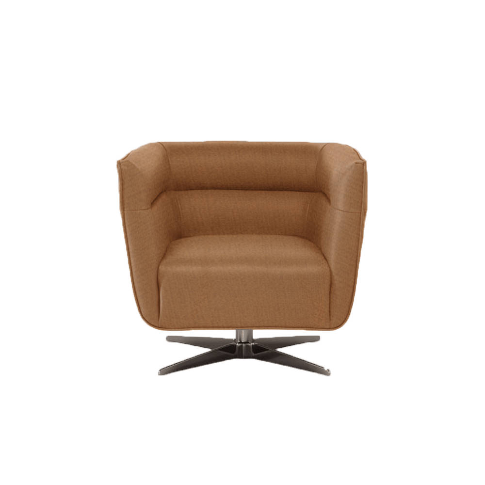 A retro-inspired swivel armchair. The cockpit-style design evokes the great classics of international design and offers a great feeling of comfort and protection. The metal base consists of a pivot with a swivel system that radiates four rays that form the feet of the armchair. A solution with a sculptural look that guarantees stability.