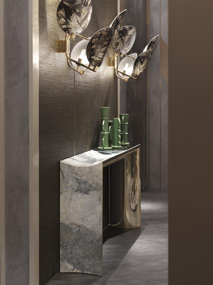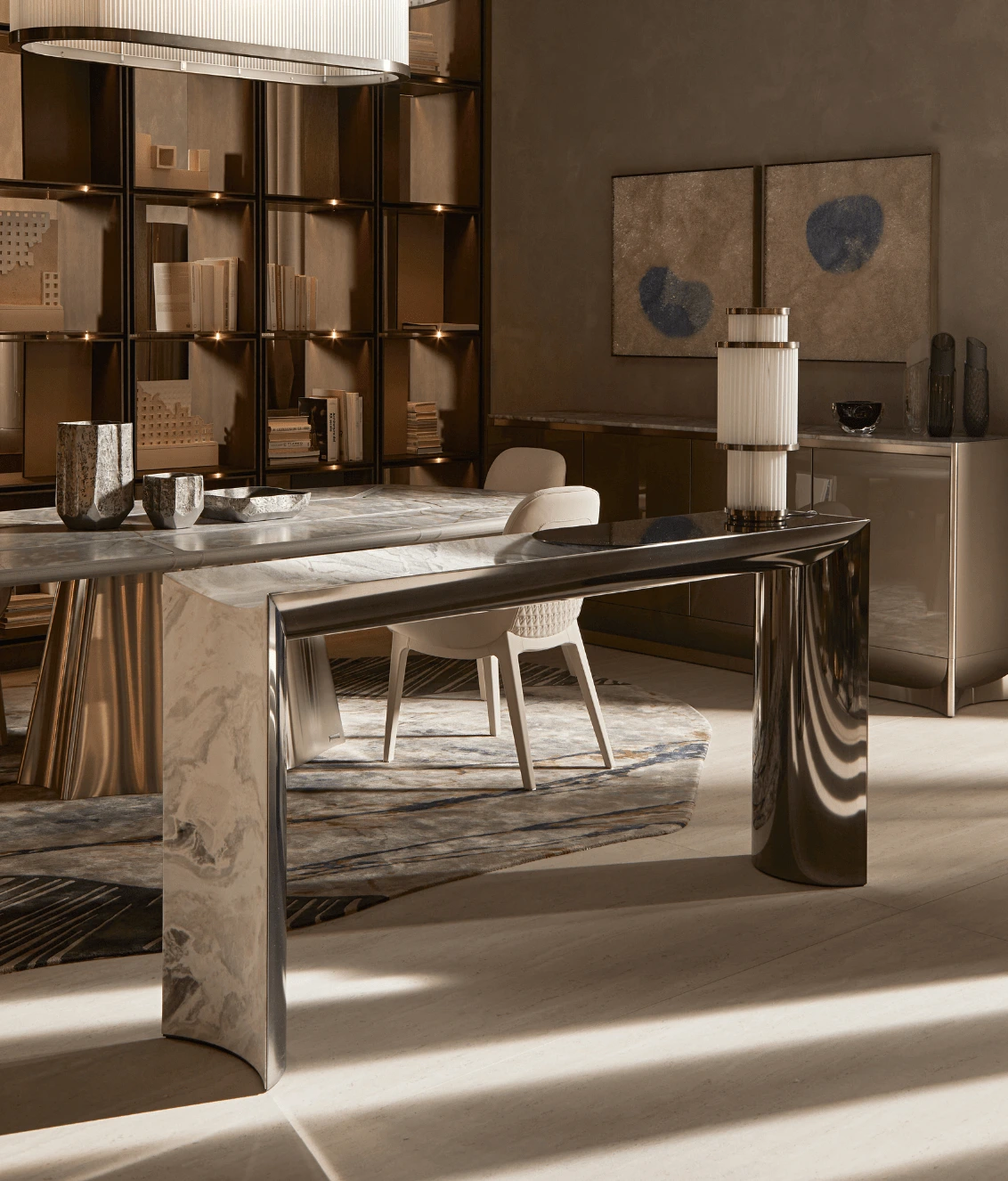 Console in sculpted solid marble, with hand-polished concave form. The interior sides of the top and legs are clad in polished stainless steel with semi-cylindrical profiles for a visually light volume interplay. Smoked glass service top. Also available in wood veneer or RADICA versions, with high-gloss 100 finish. Metal finishes available on request.