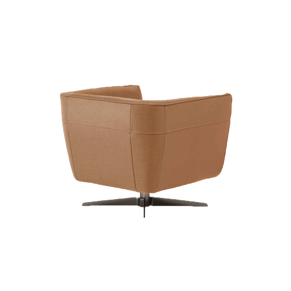 A retro-inspired swivel armchair. The cockpit-style design evokes the great classics of international design and offers a great feeling of comfort and protection. The metal base consists of a pivot with a swivel system that radiates four rays that form the feet of the armchair. A solution with a sculptural look that guarantees stability.