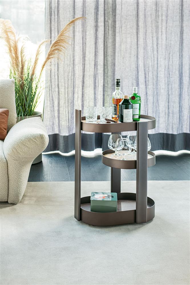 Composed of three asymmetrical levels, the Tonic bar cart is perfect for impressing guests—and indulging yourself—with an original designer bar cabinet. Tonic is a trolley disguised as a free-standing bar unit. The wheels are cleverly hidden by the tall metallic band that outlines all three shelves. While the handlebar is seamlessly integrated into the clean lines of the supporting structure. The result is both minimal and striking. Three seemingly unrelated materials come together in harmony to create a designer bar cart with a bold decorative character: captivating ceramic tops, fine wood, and sleek metallic finishes.
