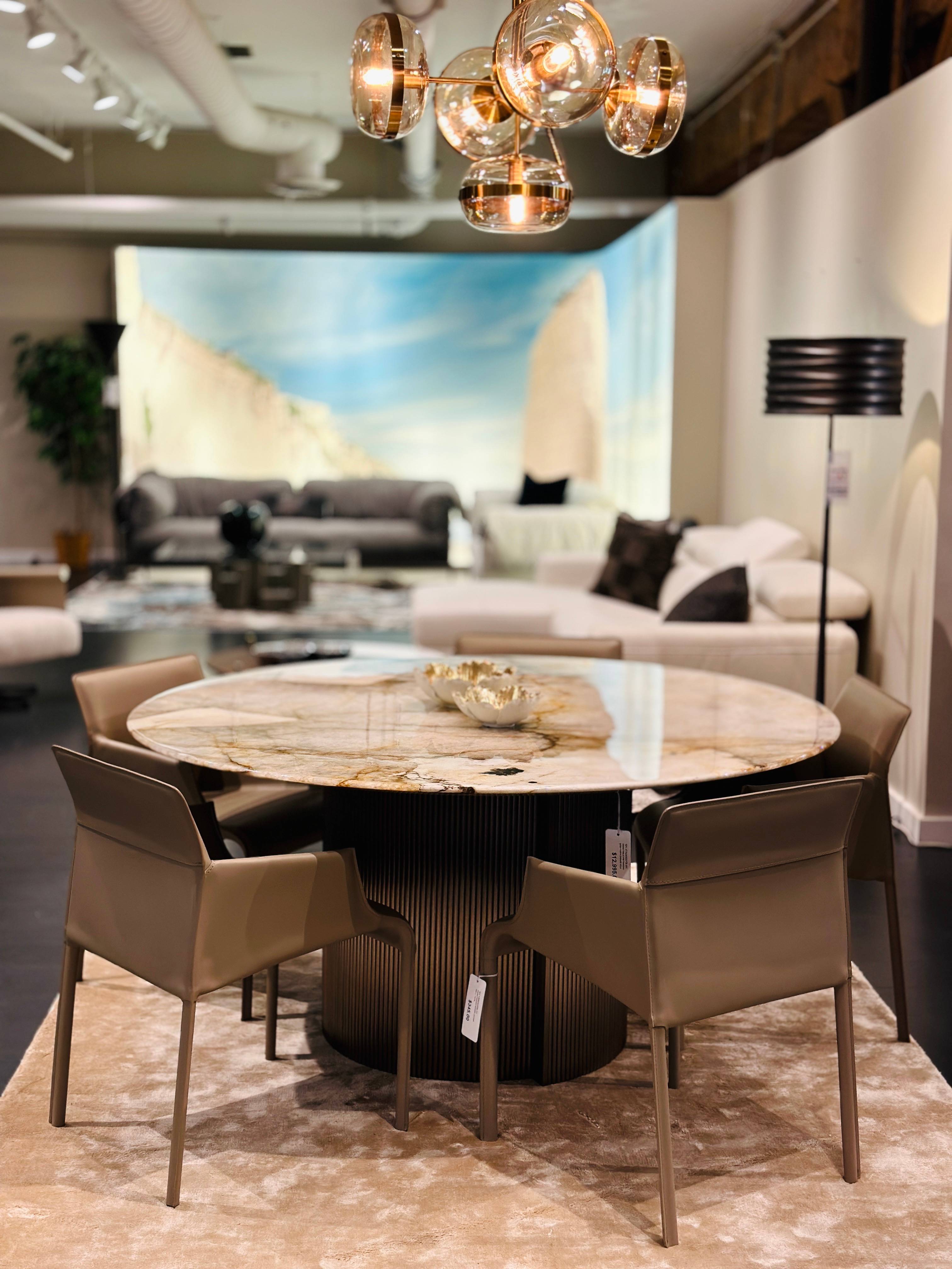 A stunning round table with a seamless, gemstone-like marble top, beautifully contrasted by a sculptural fluted base. Its unique veining and luxurious materials make it a true centerpiece for modern dining spaces.