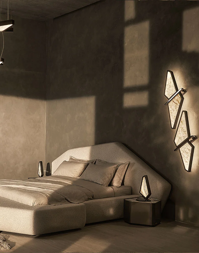 Neolito celebrates the power and beauty of nature, reinterpreting its primordial geometries into a welcoming retreat. Upholstered bed in fabric or leather, with an asymmetrical headboard defined by a polygonal geometry and fully upholstered with ergonomic curvature. The internal structure in multilayer and solid fir wood is padded with multi-density polyurethane. The bed frame can be paired with a matching pouf upon request to emphasize its sculptural form. The headboard can also be fitted with integrated power sockets upon request.